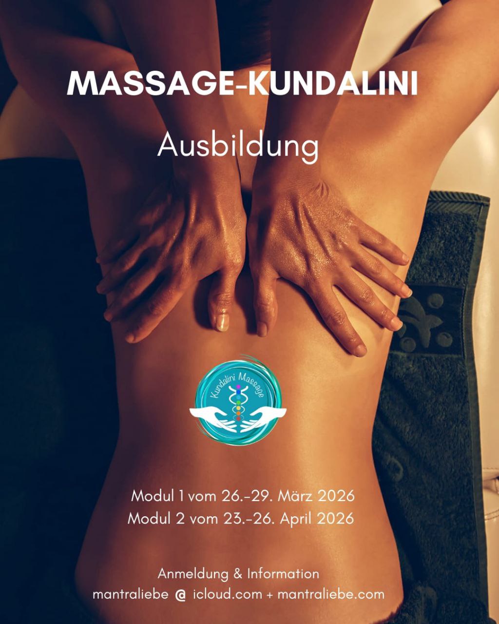 Massage-Kundalini bedeutet, Dich in das Reich der Wahrnehmung zu vertiefen, fürsorglich mit der Wärme Deines Herzens für andere Menschen da zu sein, achtsame + liebevolle Berührung zu schenken. 80 Stunden Massage-Kundalini-Ausbildung mit Dyal Kaur und Guru Prakash Massage-Kundalini ist eine Heilmassagetechnik die mitte der 80ger in die Sangat gegeben wird. In Europa gibt es zu der Zeit 3 Orte an denen sie unterrichtet wird: Amsterdam, Madrid und Rom. Einzig, in Italien fühlt eine Person sich berufen die Ausübung der Technik zu ihrer Lebensaufgabe zu machen. Mittlerweile gibt Dyal Kaur die Technik gemeinsam mit ihrer Tochter in ganz Europa weiter. Massage-Kundalini ist Liebe, Lauschen + Meditation. Vorkenntnisse nicht nötig. Die Ausbildungssprache ist Deusch.